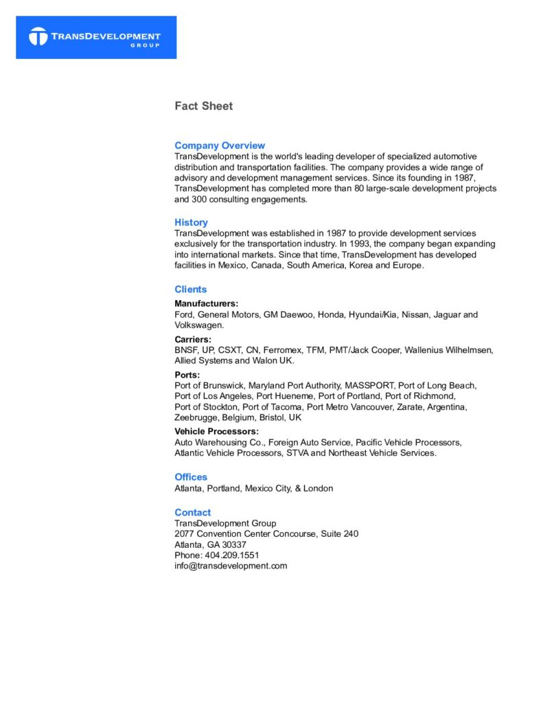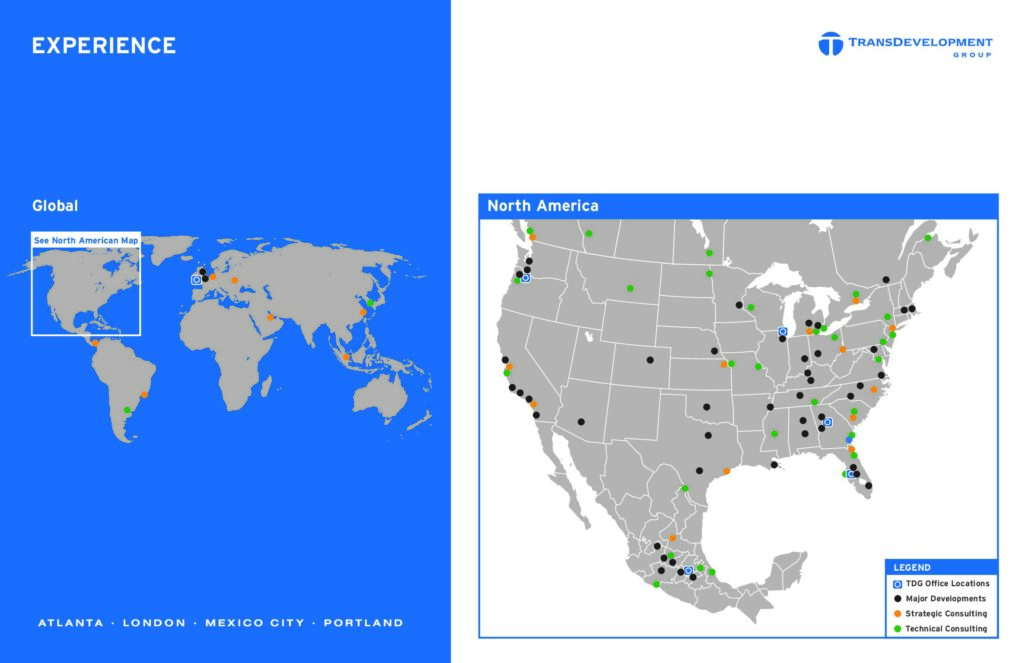 Established in 1987, TransDevelopment Group (TDG) is a world-class developer of specialized transportation facilities for shippers and carriers in the rail, highway, and marine cargo industries. In the early years, TDG helped clients build facilities throughout North America. In 1993, we began our expansion into international markets. Since that time, we’ve developed facilities in Mexico, Canada, South America, South Korea and Europe. Today, TransDevelopment’s offices in Atlanta, Chicago, Portland, Mexico City and London provide a complete range of services.